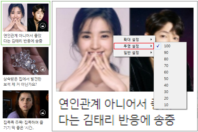 확대화면 투명도를 낮게 설정 하시고, 배경클릭을 활성화 하세요~